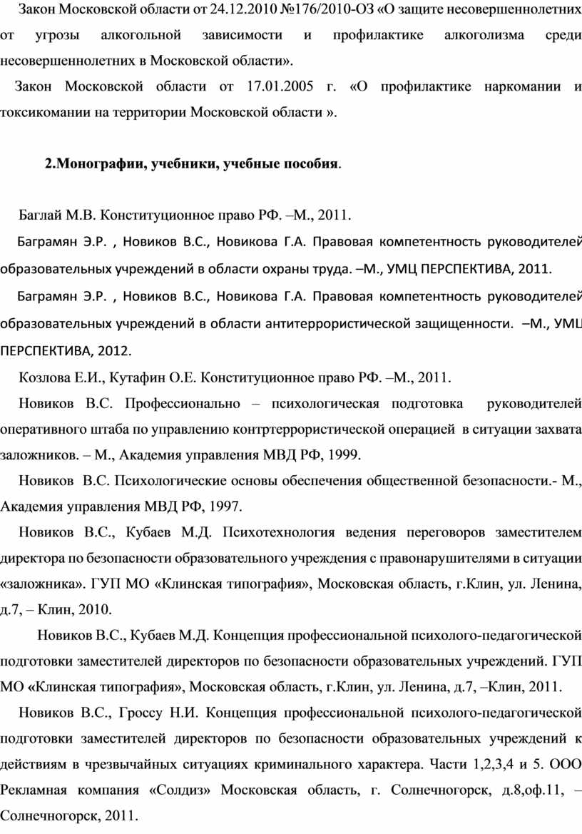 Баграмян Э.Р. , Новиков В.С., Новикова Г.А. Правовая компетентность руководителей образовательных учреждений в области антитеррористической защищенности. –М., УМЦ ПЕРСПЕКТИВА, 2012.