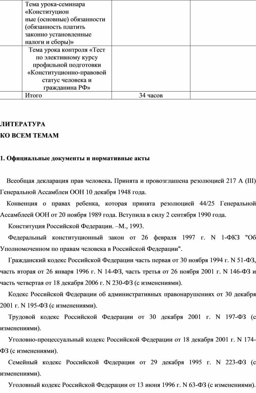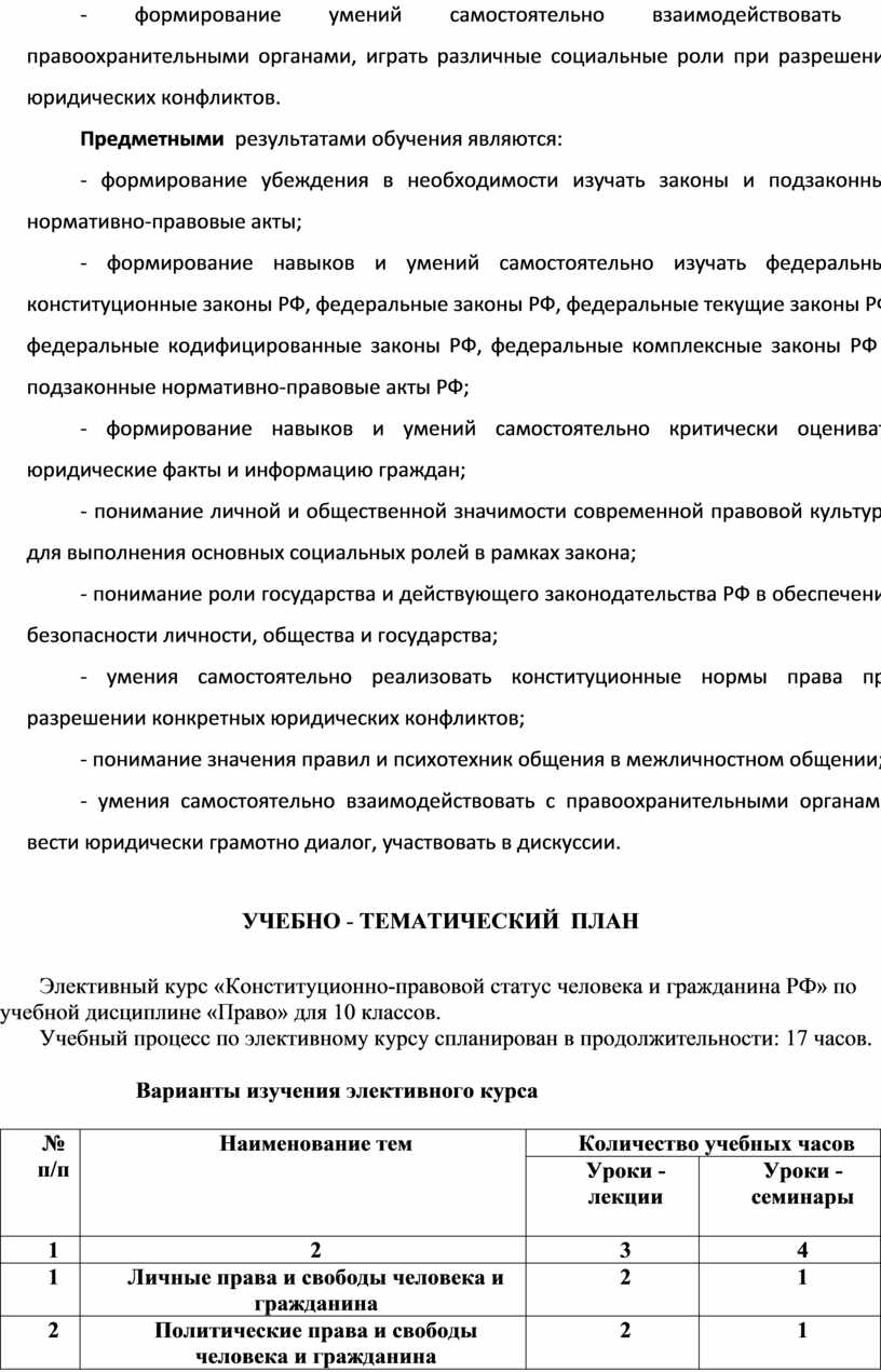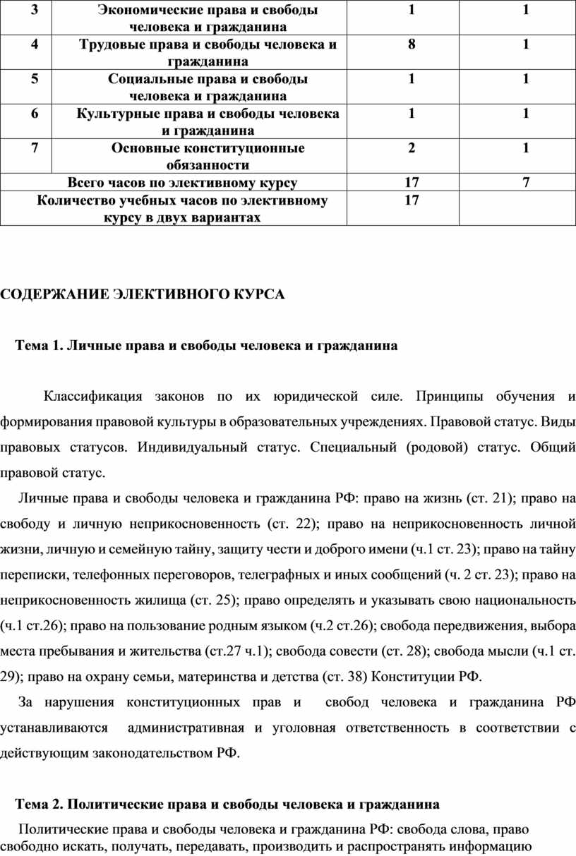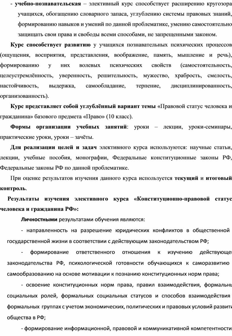 Элективный курс «Конституционно-правовой статус человека и гражданина РФ» по учебной дисциплине «Право» для 10 классов.