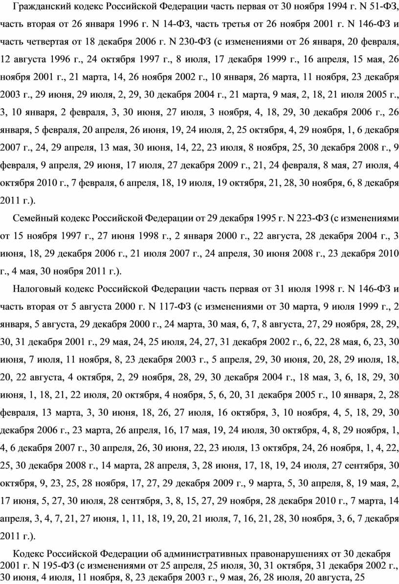 Гражданский кодекс Российской Федерации часть первая от 30 ноября 1994 г. N 51-ФЗ, часть вторая от 26 января 1996 г. N 14-ФЗ, часть третья от 26 ноября 2001 г. N 146-ФЗ и часть четвертая от 18 декабря 2006 г. N 230-ФЗ (с изменениями).