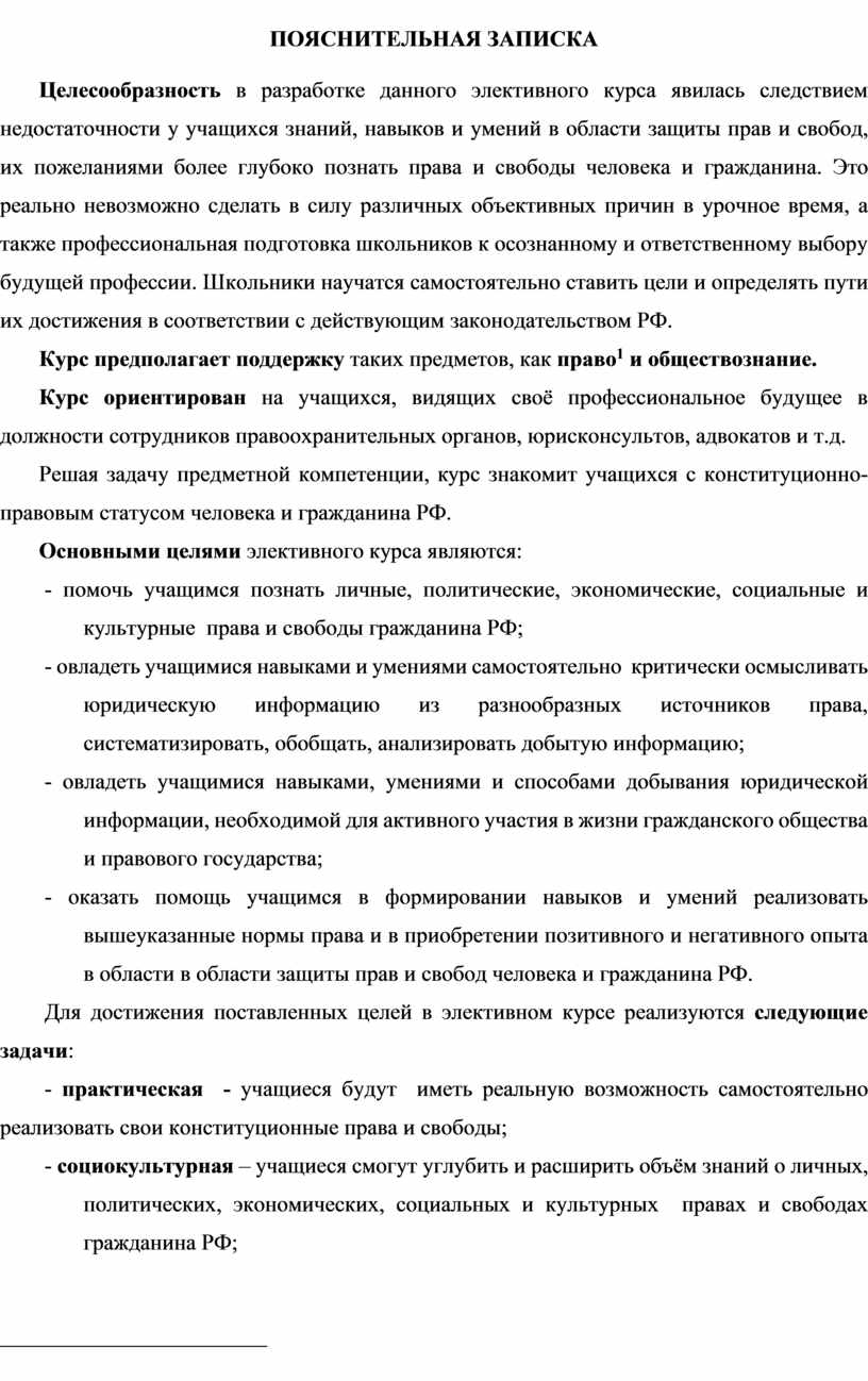 Целесообразность в разработке данного элективного курса явилась следствием недостаточности у учащихся знаний, навыков и умений в области защиты прав и свобод, их пожеланиями более глубоко познать права и свободы человека и гражданина. Это реально невозможно сделать в силу различных объективных причин в урочное время, а также профессиональная подготовка школьников к осознанному и ответственному выбору будущей профессии. Школьники научатся самостоятельно ставить цели и определять пути их достижения в соответствии с действующим законодательством РФ.