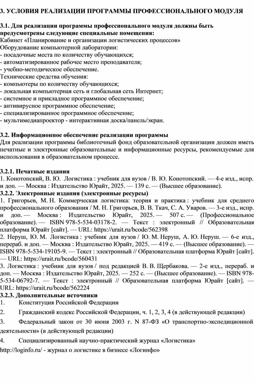 2. Неруш, Ю. М. Логистика : учебник для вузов / Ю. М. Неруш, А. Ю. Неруш. — 6-е изд., перераб. и доп. — Москва : Издательство Юрайт, 2025. — 419 с. — (Высшее образование). — ISBN 978-5-534-19105-9. — Текст : электронный // Образовательная платформа Юрайт [сайт]. — URL: https://urait.ru/bcode/560431