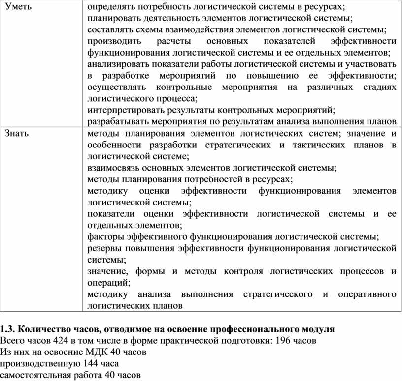 определять потребность логистической системы в ресурсах; планировать деятельность элементов логистической системы; составлять схемы взаимодействия элементов логистической системы; производить расчеты основных показателей эффективности функционирования логистической системы и ее отдельных элементов; анализировать показатели работы логистической системы и участвовать в разработке мероприятий по повышению ее эффективности; осуществлять контрольные мероприятия на различных стадиях логистического процесса; интерпретировать результаты контрольных мероприятий; разрабатывать мероприятия по результатам анализа выполнения планов |