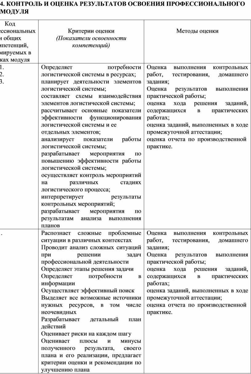 4. КОНТРОЛЬ И ОЦЕНКА РЕЗУЛЬТАТОВ ОСВОЕНИЯ ПРОФЕССИОНАЛЬНОГО МОДУЛЯ