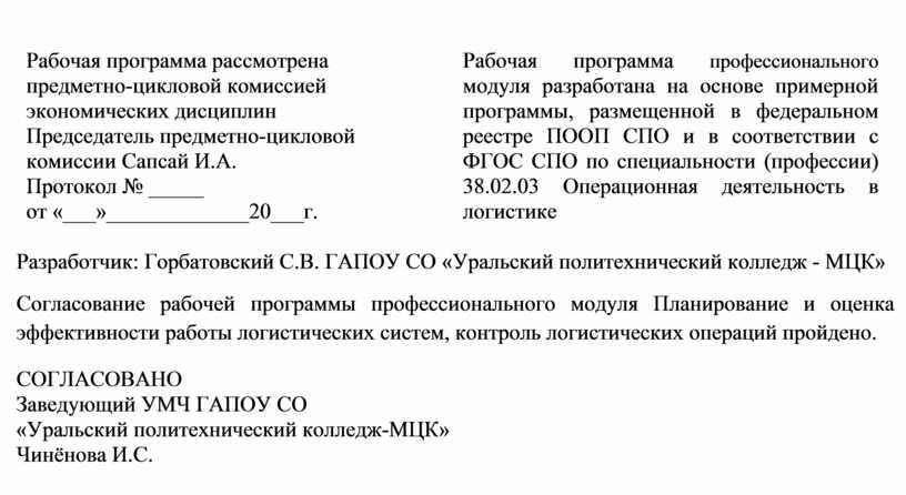 Согласование рабочей программы профессионального модуля Планирование и оценка эффективности работы логистических систем, контроль логистических операций пройдено.