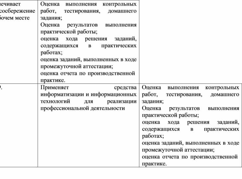 Оценка выполнения контрольных работ, тестирования, домашнего задания; Оценка результатов выполнения практической работы; оценка хода решения заданий, содержащихся в практических работах; оценка заданий, выполненных в ходе промежуточной аттестации; оценка отчета по производственной практике. |