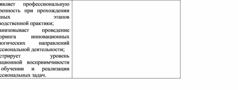 - демонстрирует способность к адаптации в изменяющихся условиях профессиональной деятельности; - проявляет профессиональную маневренность при прохождении различных этапов производственной практики; - организовывает проведение мониторинга инновационных технологических направлений профессиональной деятельности; демонстрирует уровень инновационной восприимчивости при обучении и реализации профессиональных задач. |