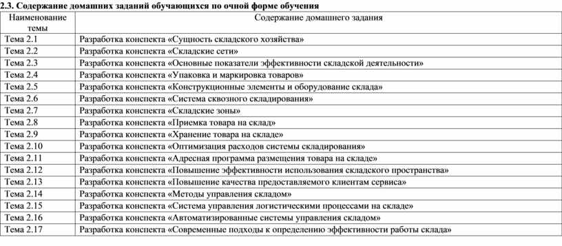 2.3. Содержание домашних заданий обучающихся по очной форме обучения