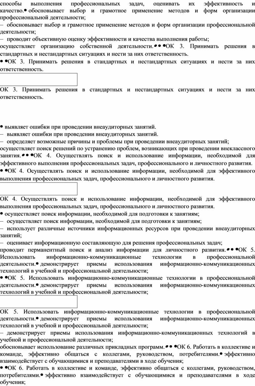 - осуществляет поиск информации, необходимой для подготовки к занятиям; - использует различные источники информационных ресурсов при проведении внеаудиторных занятий; - оценивает информационную составляющую для решения профессиональных задач; проводит перманентный поиск и анализ информации для личностного развития. |