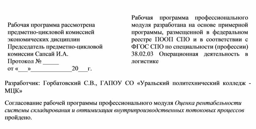 Согласование рабочей программы профессионального модуля Оценка рентабельности системы складирования и оптимизация внутрипроизводственных потоковых процессов пройдено.