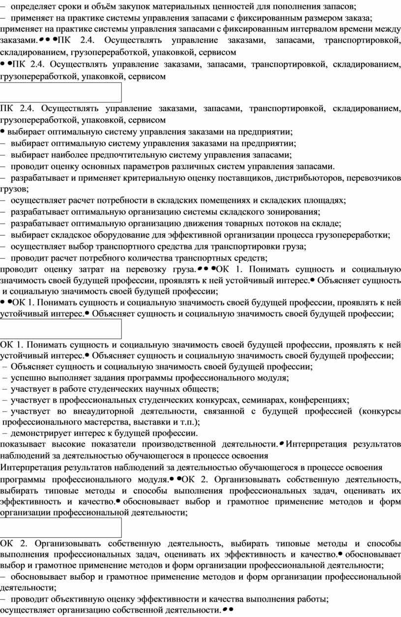 - рационально применяет методологии проектирования процесса закупок на предприятии; - эффективно применяет методологии проектирования систем управления запасами при решении производственных задач (СФРЗ, СФИВЗ); - применяет оригинальные системы управления запасами во внутрипроизводственных логистических системах; - проектирует рациональное движение материальных ресурсов во внутрипроизводственных логистических системах; - применяет методологии проектирования зон складских помещений; - применяет рациональное размещение товаров на складе. - интерпретирует результат разработки транспортно-технологических схем перевозочного процесса; - оценивает качество рекомендаций по разработке эффективных технологических схем перевозки.