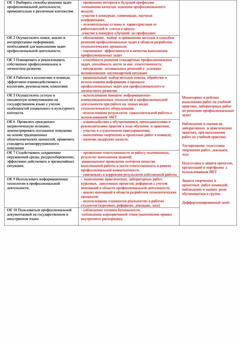- обоснование, выбор и применение методов и способов решения профессиональных задач в области разработки технологических процессов; - оценивание эффективности и качества выполнения профессиональных задач |