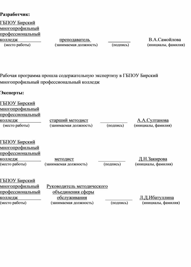Рабочая программа прошла содержательную экспертизу в ГБПОУ Бирский многопрофильный профессиональный колледж
