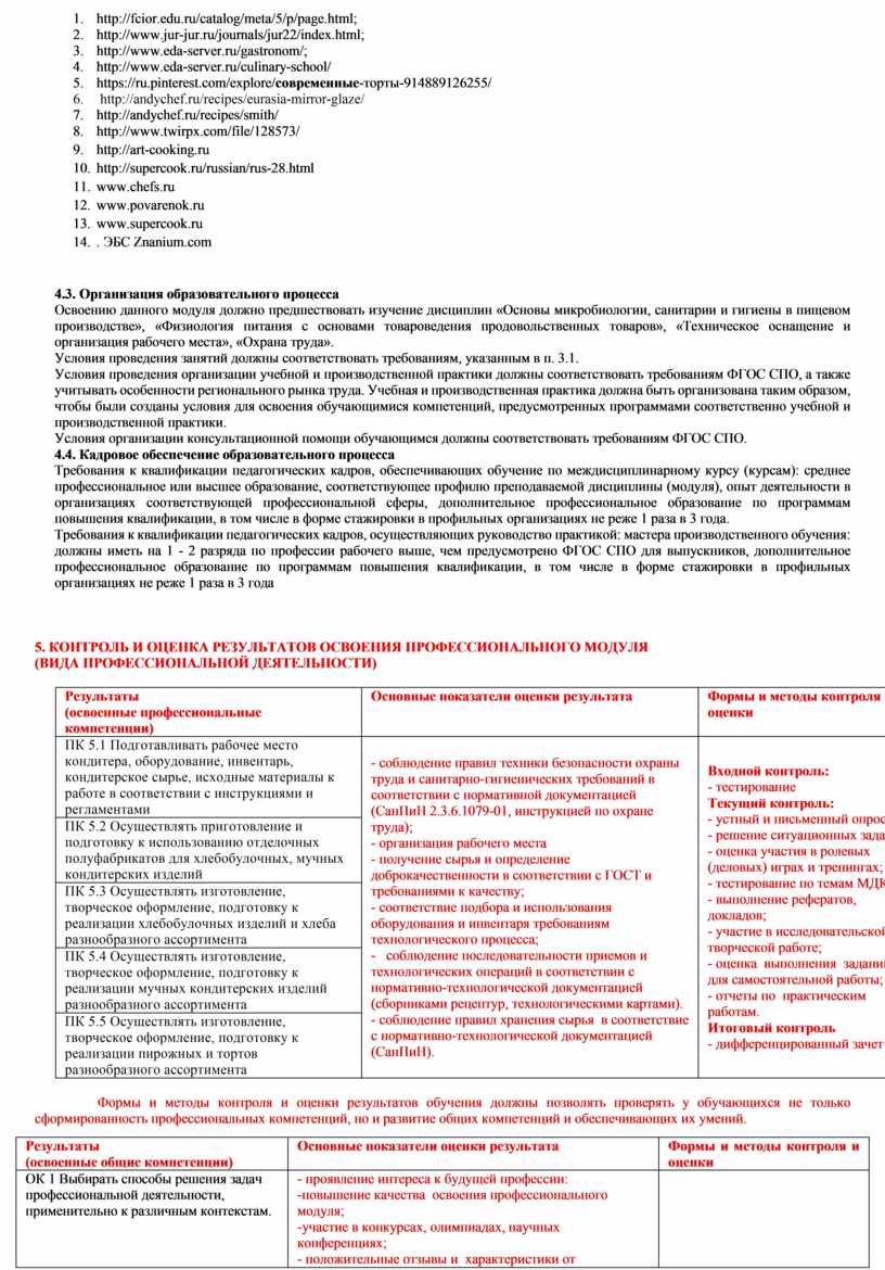 ПК 5.1. Подготавливать рабочее место кондитера, оборудование, инвентарь, кондитерское сырье, исходные материалы к работе в соответствии с инструкциями и регламентами.