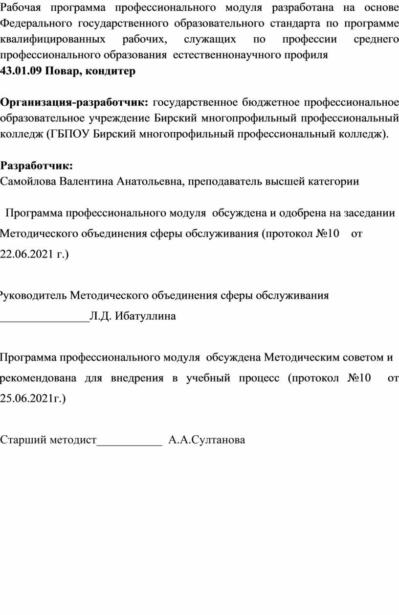 Организация-разработчик: государственное бюджетное профессиональное образовательное учреждение Бирский многопрофильный профессиональный колледж (ГБПОУ Бирский многопрофильный профессиональный колледж).