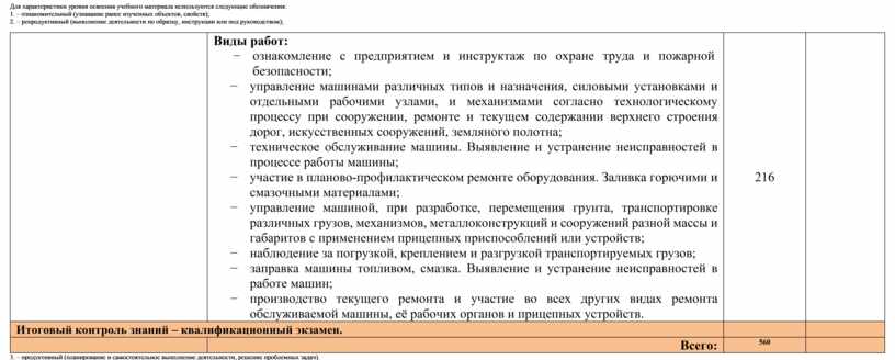 − управления машинами в различных ситуациях, при производстве работ, в том числе и при возникновении нештатных ситуаций; − технологической настройки систем и регулировки работы рабочих органов; − погрузки-выгрузки, увязки, транспортировки различными видами транспорта; − выполнения дорожно-строительных работ в строгом соответствии с технологией производства, с соблюдением правил безопасности производства; − оформления технической и отчетной документации; |