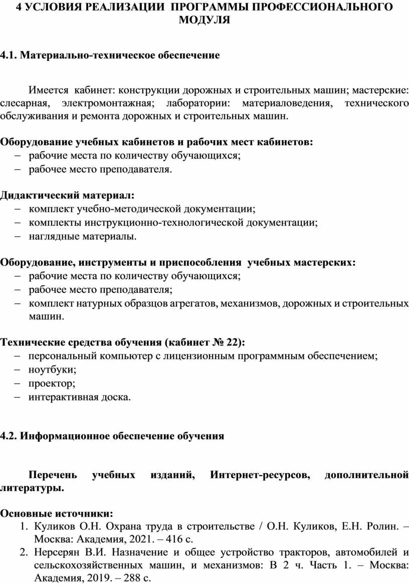Имеется кабинет: конструкции дорожных и строительных машин; мастерские: слесарная, электромонтажная; лаборатории: материаловедения, технического обслуживания и ремонта дорожных и строительных машин.