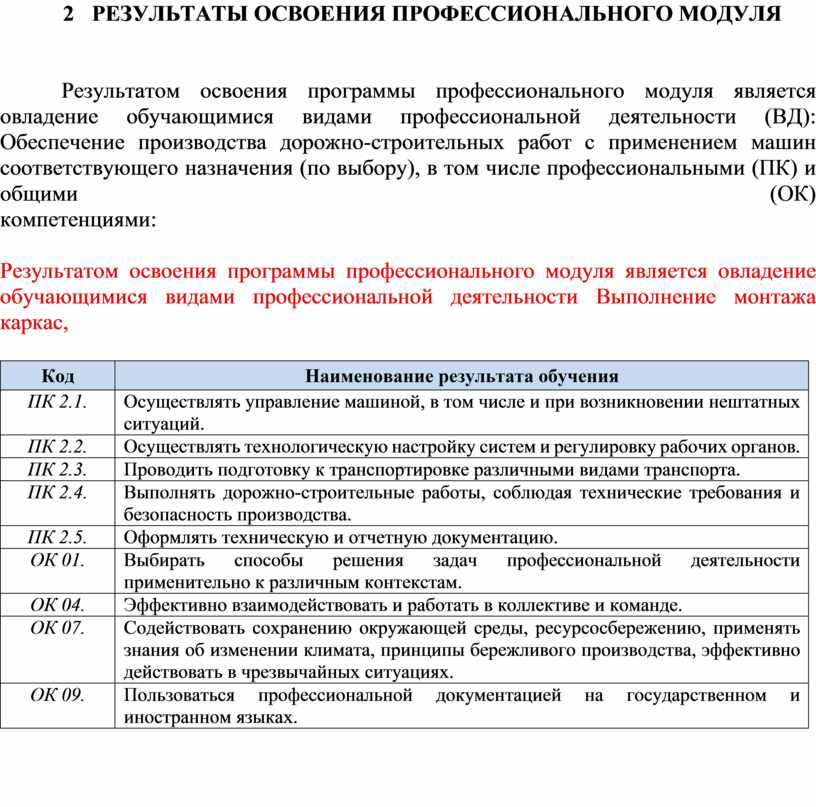 В результате изучения профессионального модуля обучающийся должен освоить основной вид деятельности (ВД): Обеспечение производства дорожно-строительных работ с применением машин соответствующего назначения (по выбору) и соответствующие ему общие и профессиональные компетенции.
