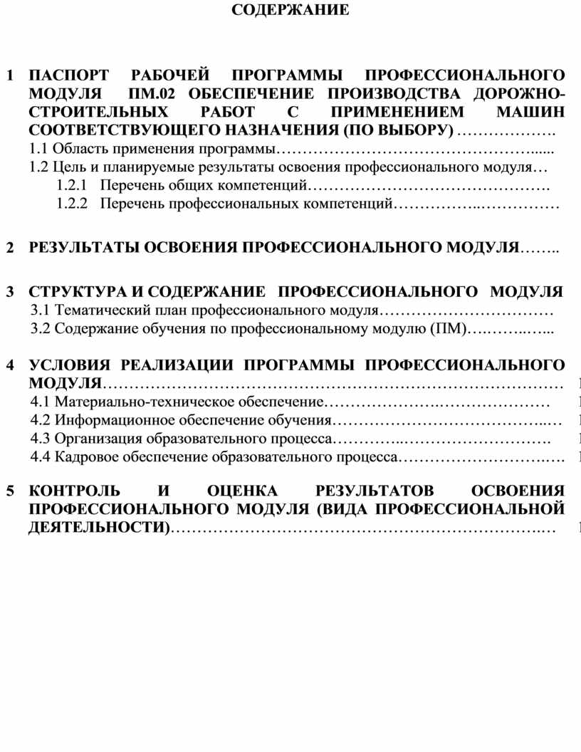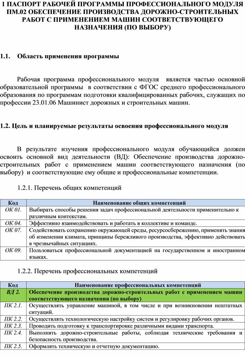 ПАСПОРТ РАБОЧЕЙ ПРОГРАММЫ ПРОФЕССИОНАЛЬНОГО МОДУЛЯ ПМ.02 ОБЕСПЕЧЕНИЕ ПРОИЗВОДСТВА ДОРОЖНО-СТРОИТЕЛЬНЫХ РАБОТ С ПРИМЕНЕНИЕМ МАШИН СООТВЕТСТВУЮЩЕГО НАЗНАЧЕНИЯ (ПО ВЫБОРУ) ………………. |