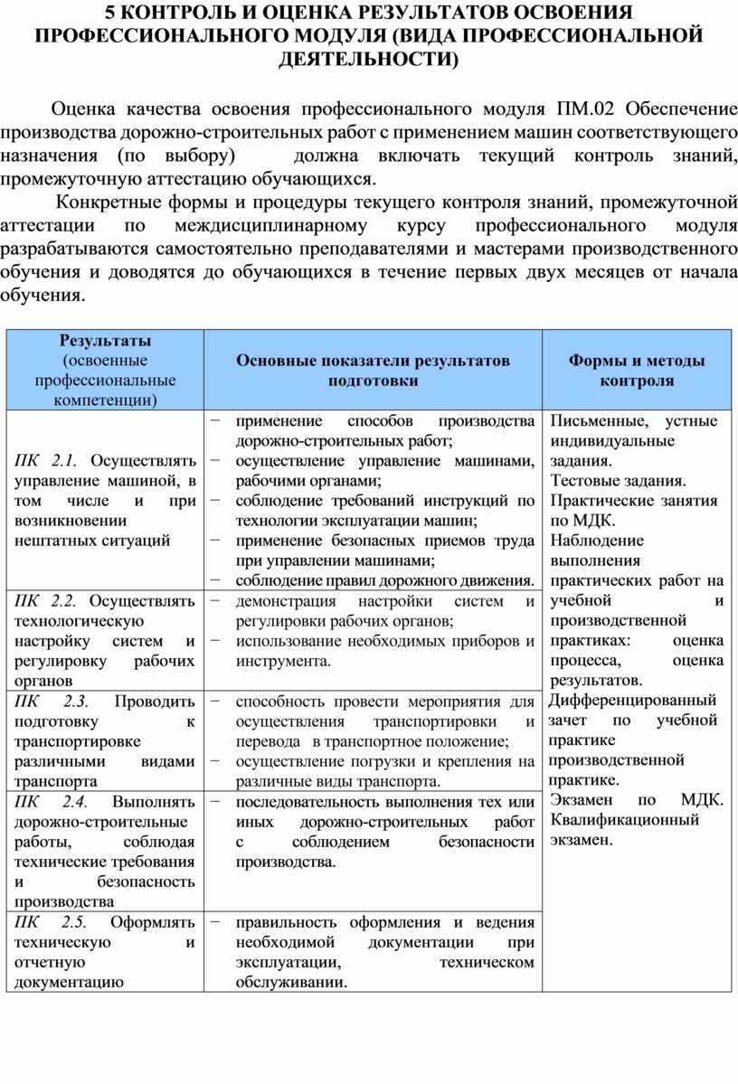Оценка качества освоения профессионального модуля ПМ.02 Обеспечение производства дорожно-строительных работ с применением машин соответствующего назначения (по выбору) должна включать текущий контроль знаний, промежуточную аттестацию обучающихся.
