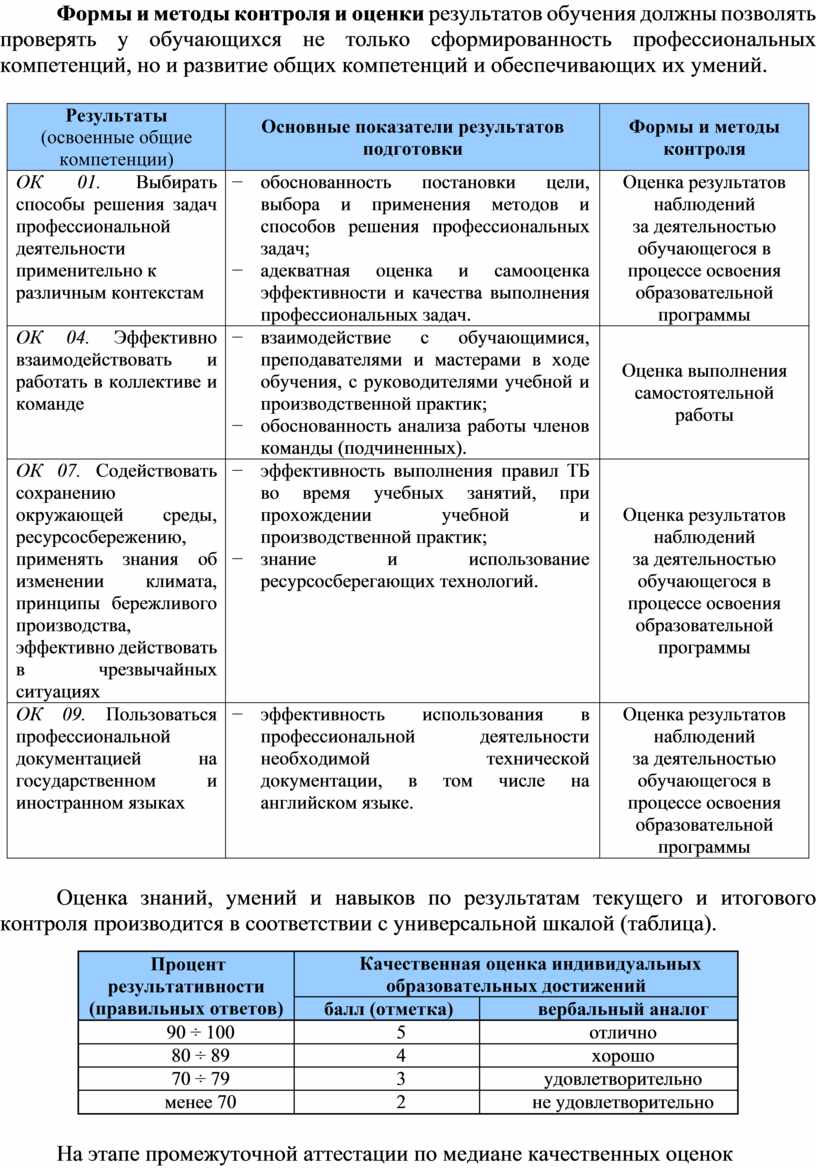 Формы и методы контроля и оценки результатов обучения должны позволять проверять у обучающихся не только сформированность профессиональных компетенций, но и развитие общих компетенций и обеспечивающих их умений.