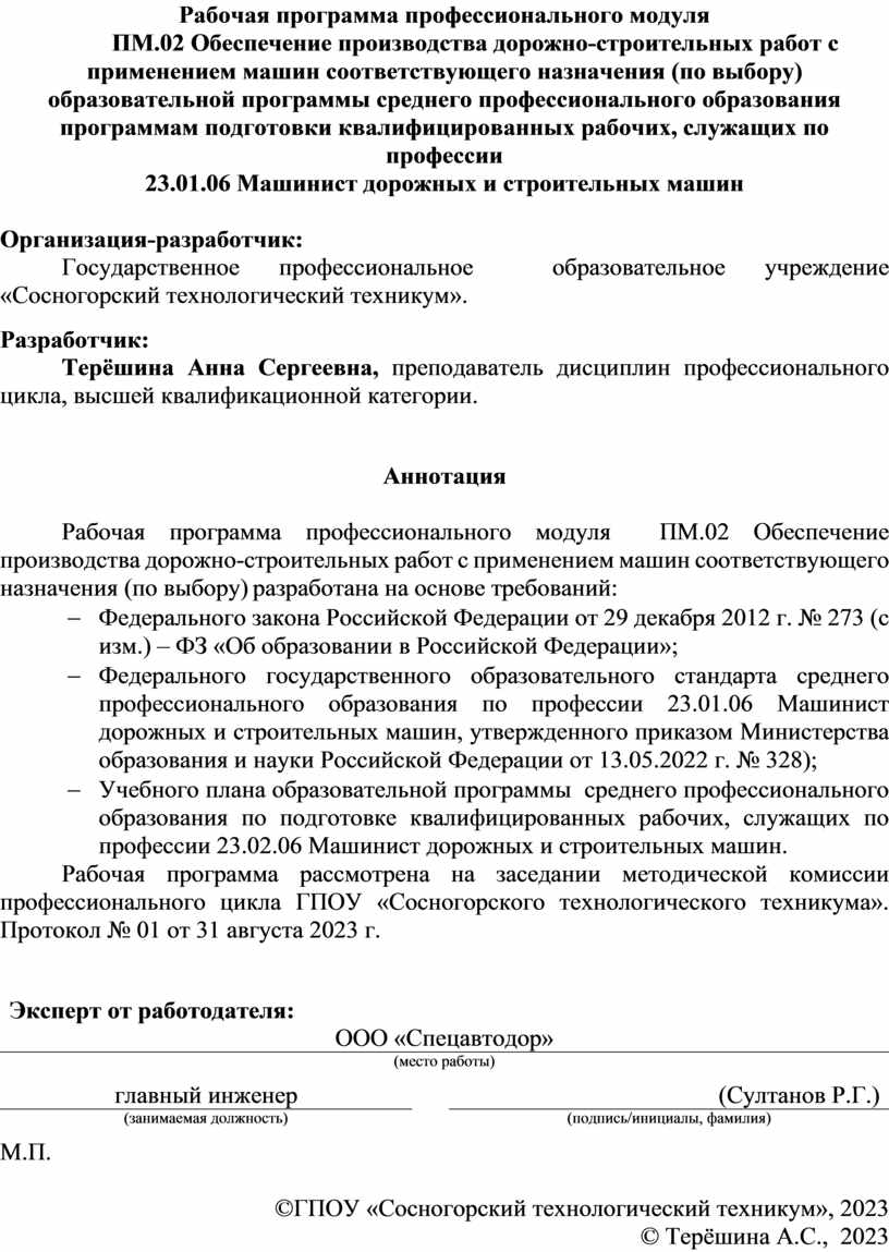 Рабочая программа рассмотрена на заседании методической комиссии профессионального цикла ГПОУ «Сосногорского технологического техникума». Протокол № 01 от 31 августа 2023 г.