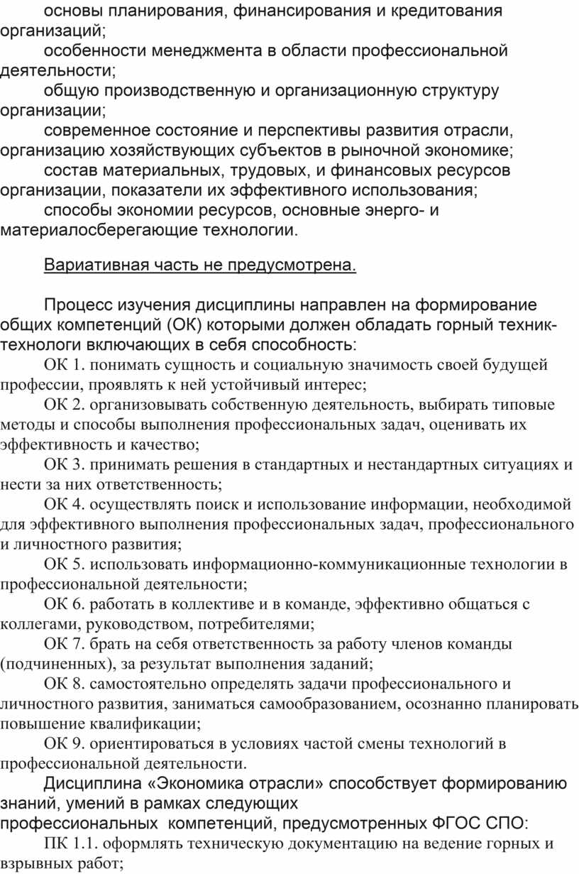 Рабочая программа учебной дисциплины «Экономика отрасли» является частью программы подготовки специалистов среднего звена в соответствии с ГОС СПО по специальности 21.03.17 «Подземная разработка месторождений полезных ископаемых»