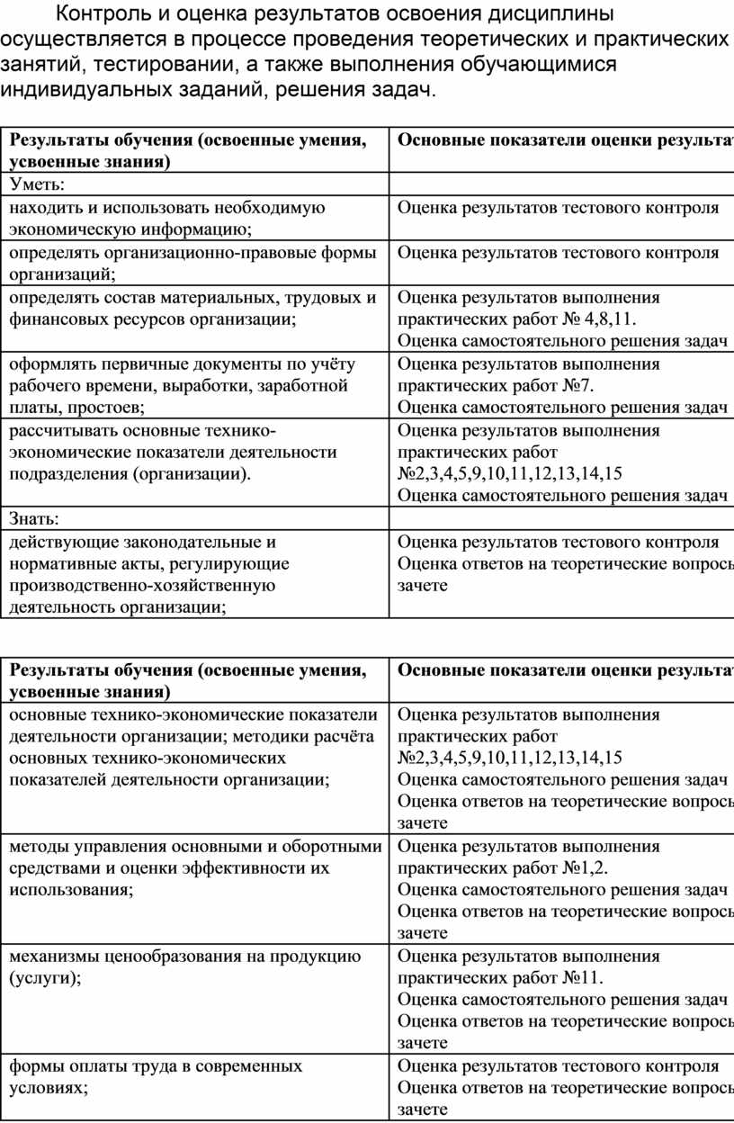 основные технико-экономические показатели деятельности организации; методики расчёта основных технико-экономических показателей деятельности организации; |