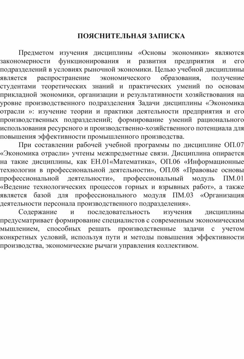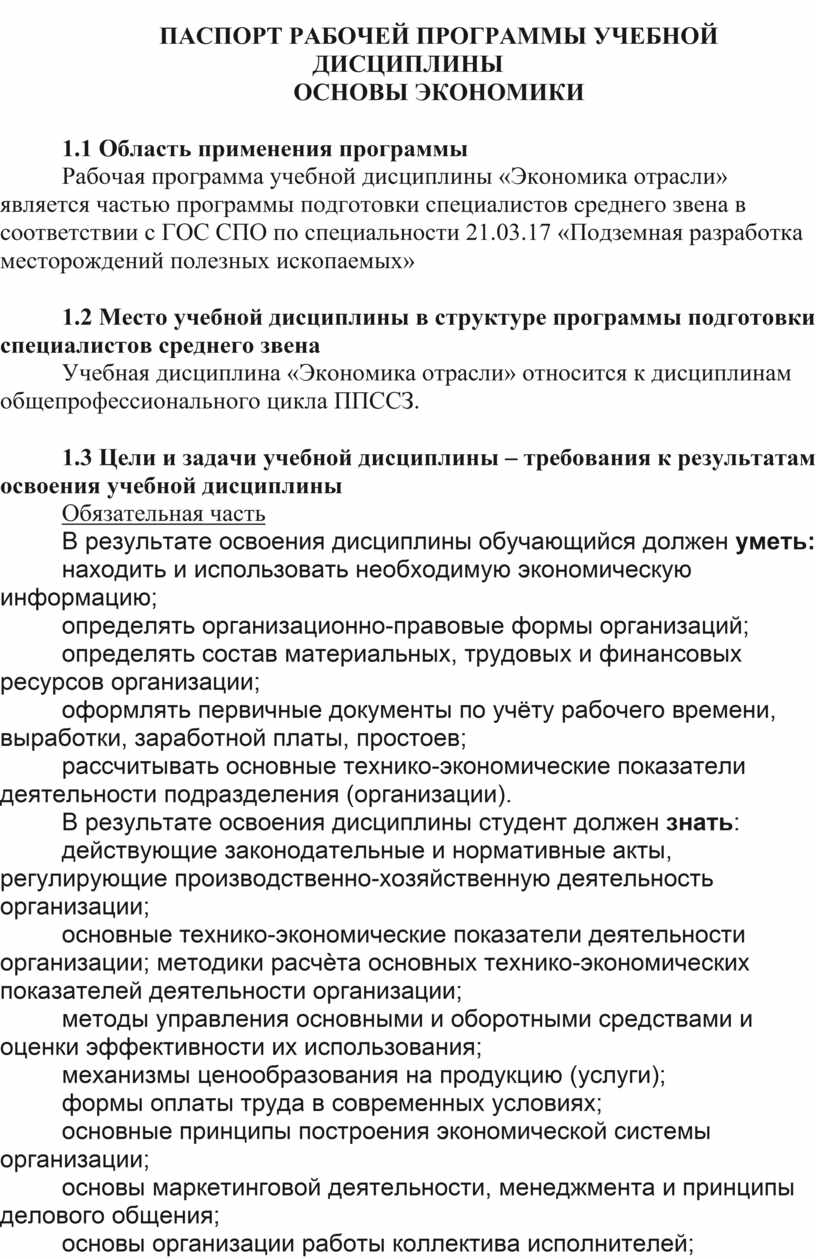 Предметом изучения дисциплины «Основы экономики» являются закономерности функционирования и развития предприятия и его подразделений в условиях рыночной экономики. Целью учебной дисциплины является распространение экономического образования, получение студентами теоретических знаний и практических умений по основам прикладной экономики, организации и результативности хозяйствования на уровне производственного подразделения Задачи дисциплины «Экономика отрасли »: изучение теории и практики деятельности предприятия и его производственных подразделений; формирование умений рационального использования ресурсного и производственно-хозяйственного потенциала для повышения эффективности промышленного производства.