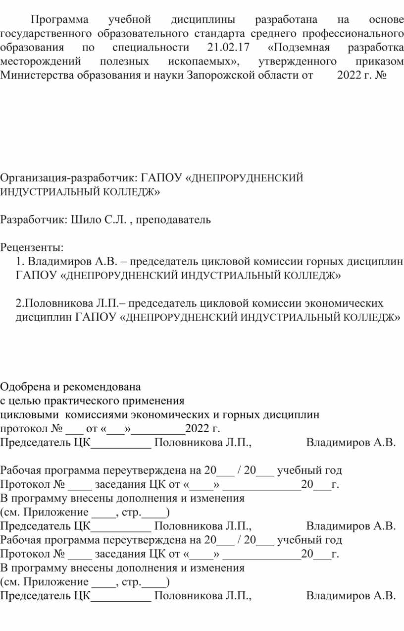Программа учебной дисциплины разработана на основе государственного образовательного стандарта среднего профессионального образования по специальности 21.02.17 «Подземная разработка месторождений полезных ископаемых», утвержденного приказом Министерства образования и науки Запорожской области от 2022 г. №