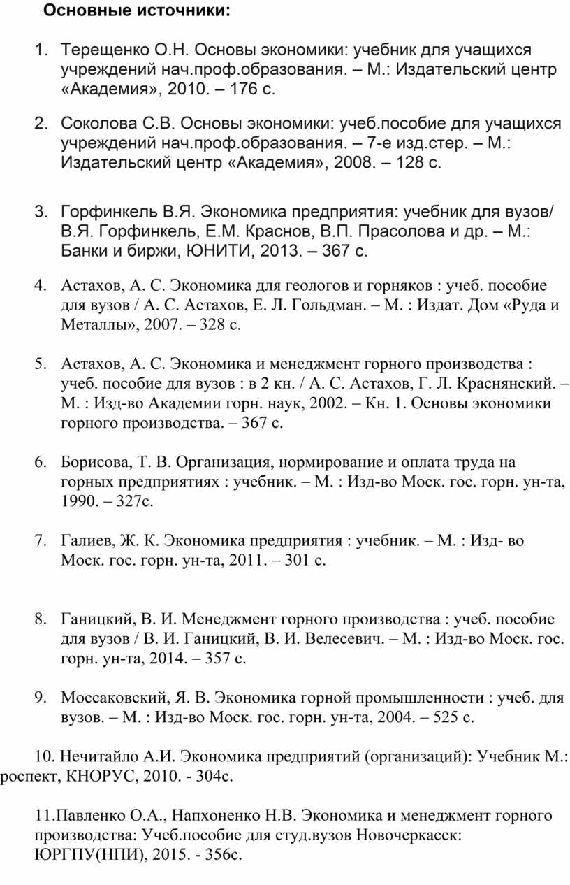 11.Павленко О.А., Напхоненко Н.В. Экономика и менеджмент горного производства: Учеб.пособие для студ.вузов Новочеркасск: ЮРГПУ(НПИ), 2015. - 356с.