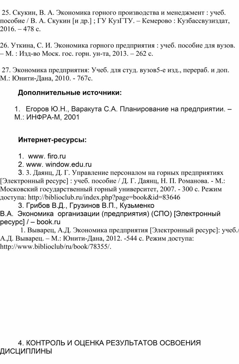 25. Скукин, В. А. Экономика горного производства и менеджмент : учеб. пособие / В. А. Скукин [и др.] ; ГУ КузГТУ. – Кемерово : Кузбассвузиздат, 2016. – 478 с.
