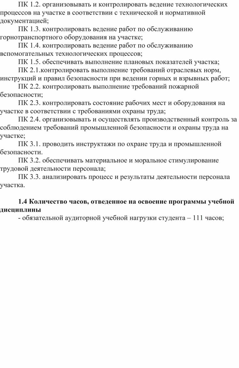 ПК 2.4. организовывать и осуществлять производственный контроль за соблюдением требований промышленной безопасности и охраны труда на участке;