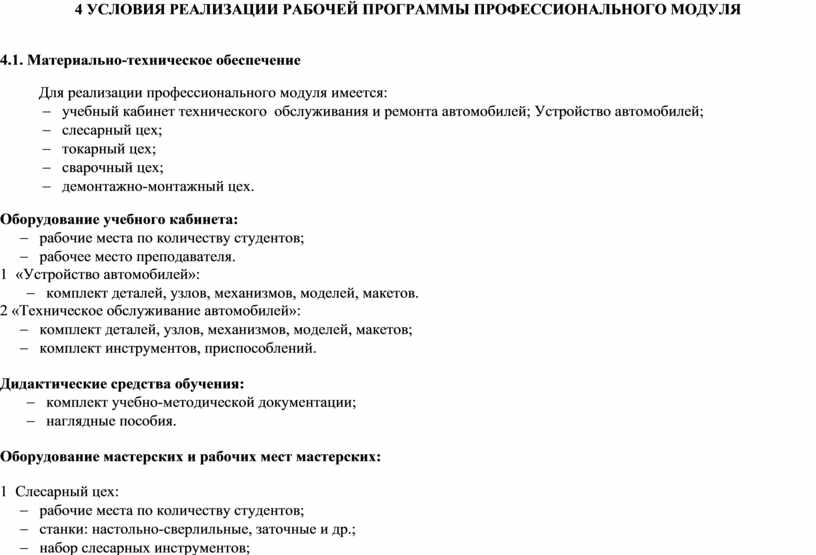 Рабочая программа профессионального модуля предполагает обязательную учебную практику и производственную практику в мастерских образовательного учреждения или на предприятиях города.