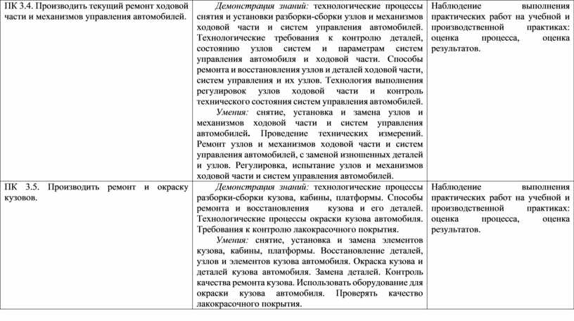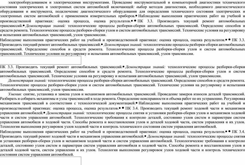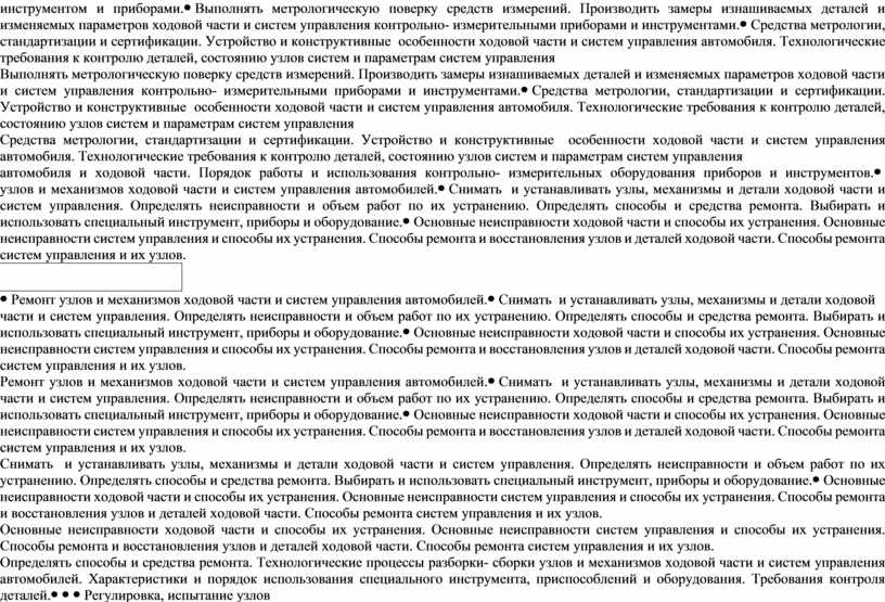 Демонстрация знаний: технологические процессы снятия и установки разборки-сборки узлов и механизмов ходовой части и систем управления автомобилей. Технологические требования к контролю деталей, состоянию узлов систем и параметрам систем управления автомобиля и ходовой части. Способы ремонта и восстановления узлов и деталей ходовой части, систем управления и их узлов. Технология выполнения регулировок узлов ходовой части и контроль технического состояния систем управления автомобилей. Умения: снятие, установка и замена узлов и механизмов ходовой части и систем управления автомобилей. Проведение технических измерений. Ремонт узлов и механизмов ходовой части и систем управления автомобилей, с заменой изношенных деталей и узлов. Регулировка, испытание узлов и механизмов ходовой части и систем управления автомобилей. |