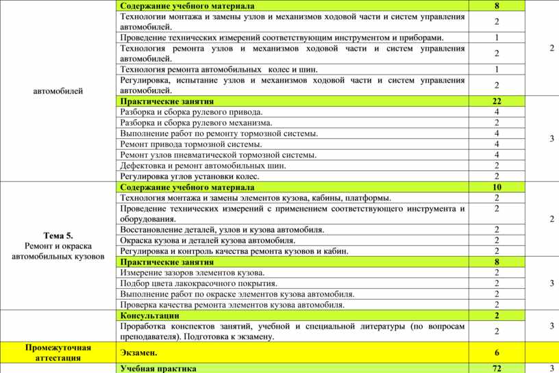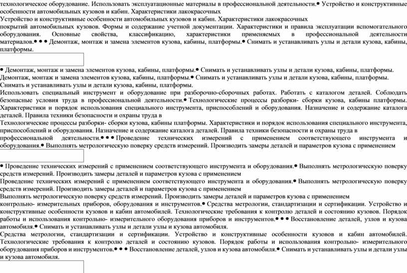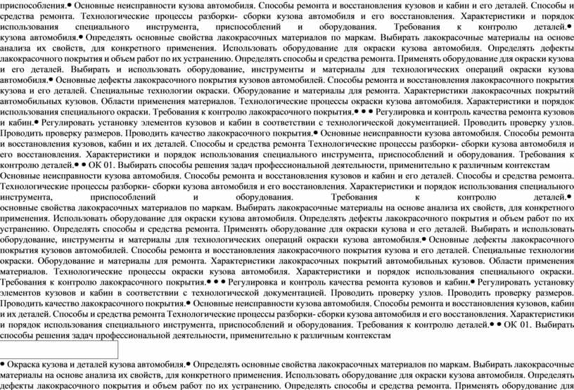 Демонстрация знаний: технологические процессы разборки-сборки кузова, кабины, платформы. Способы ремонта и восстановления кузова и его деталей. Технологические процессы окраски кузова автомобиля. Требования к контролю лакокрасочного покрытия. Умения: снятие, установка и замена элементов кузова, кабины, платформы. Восстановление деталей, узлов и элементов кузова автомобиля. Окраска кузова и деталей кузова автомобиля. Замена деталей. Контроль качества ремонта кузова. Использовать оборудование для окраски кузова автомобиля. Проверять качество лакокрасочного покрытия. |