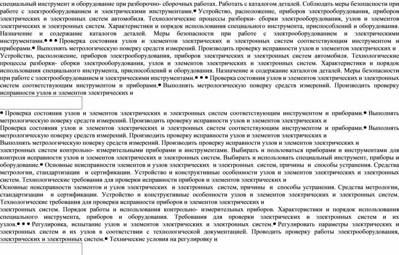Демонстрация знаний: технологические процессы разборки-сборки электрооборудования, узлов и элементов электрических и электронных систем. Основные неисправности элементов и узлов электрических и электронных систем, причины и способы устранения. Способы ремонта узлов и элементов электрических и электронных систем. Умения: соблюдение мер безопасности при работе с электрооборудованием и электрическими инструментами. Проведение инструментальной и компьютерной диагностики технического состояния электрических и электронных систем автомобилей включающей: выбор методов диагностики, необходимого диагностического оборудования и инструмента, подключение диагностического оборудования для определения технического состояния электрических и электронных систем автомобилей с применением измерительных приборов. |