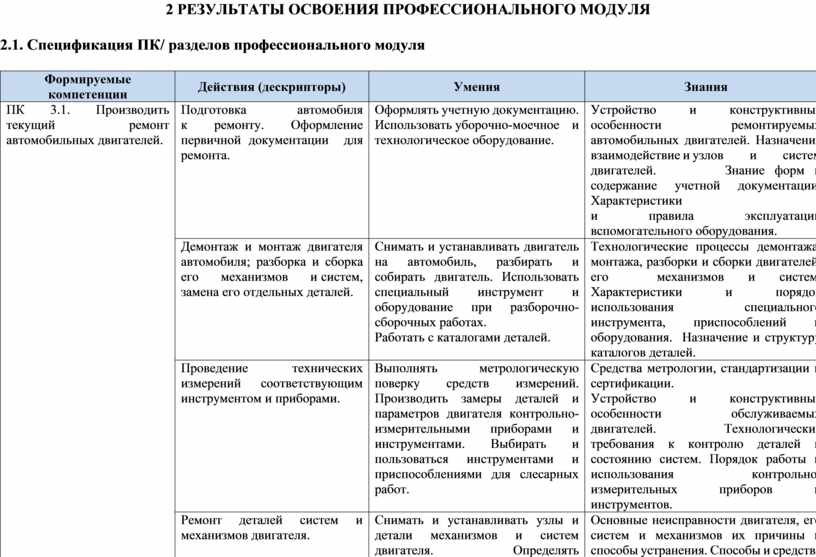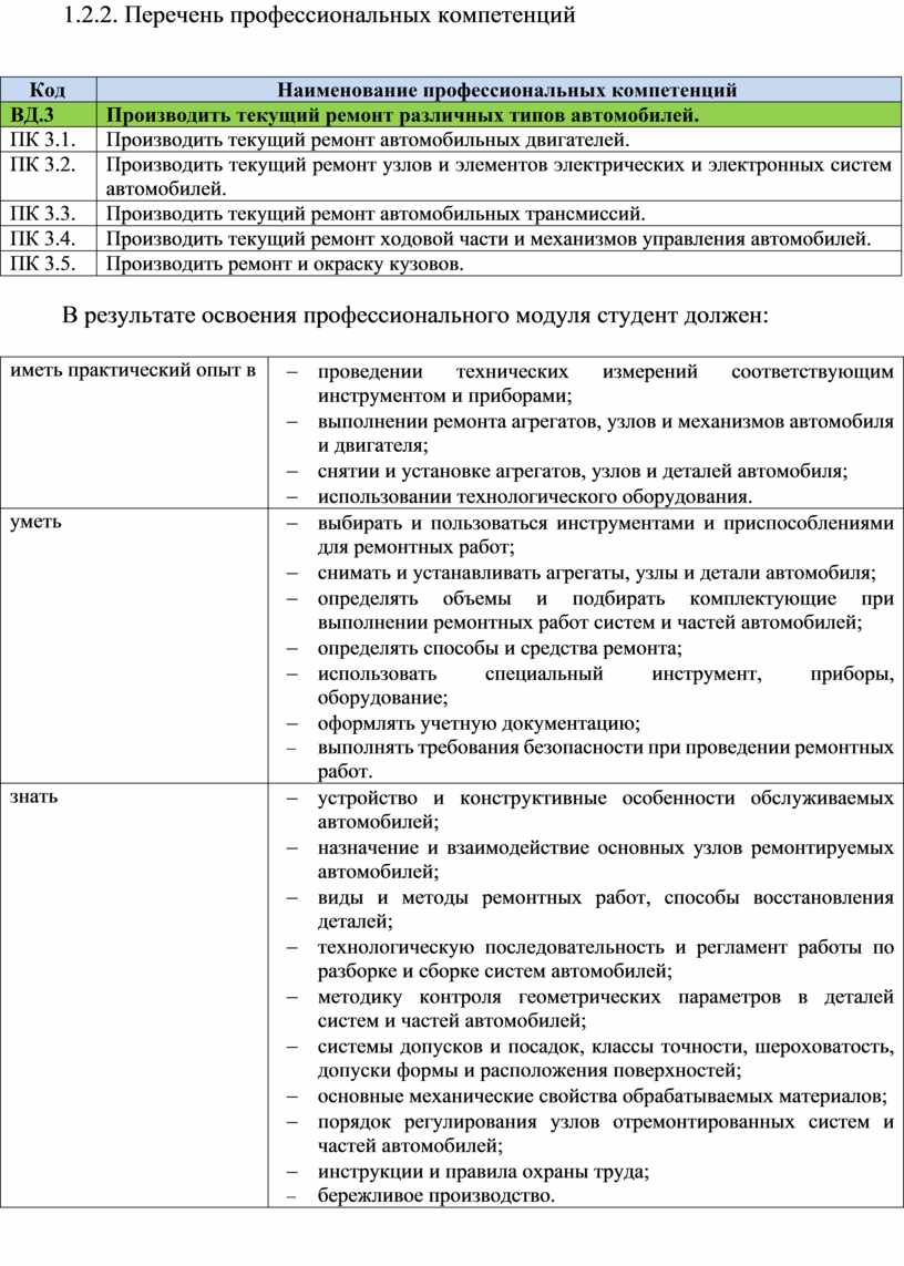 В результате изучения профессионального модуля студент должен освоить основной вид деятельности: Производить текущий ремонт различных типов автомобилей и соответствующие ему общие и профессиональные компетенции.