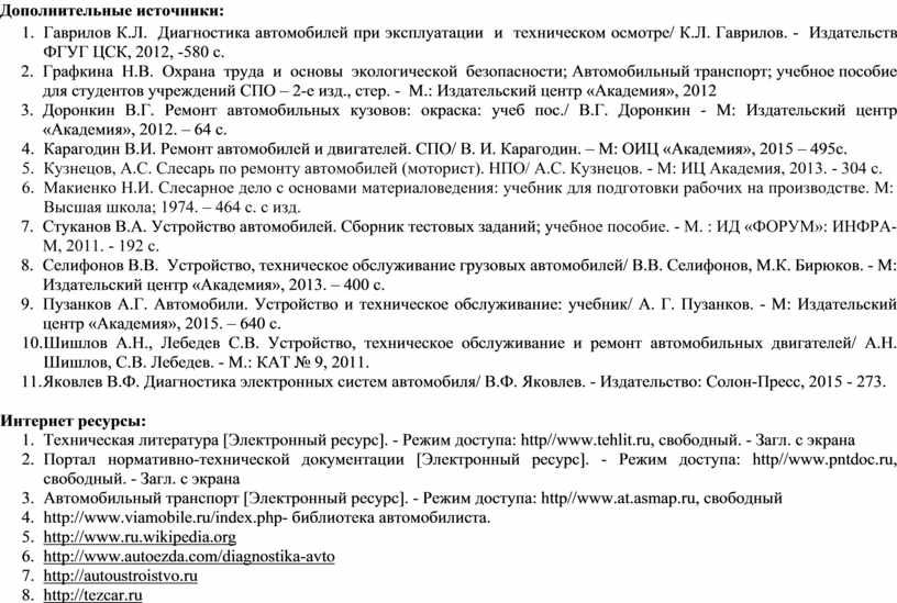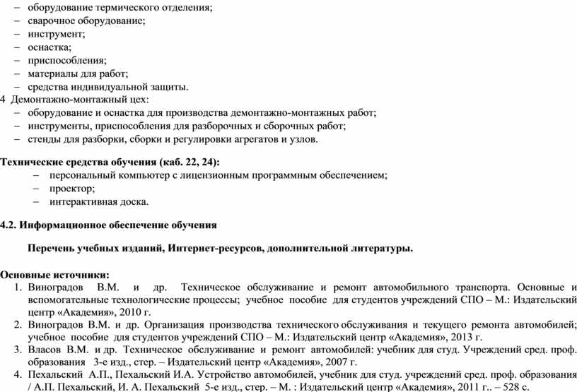 1. Виноградов В.М. и др. Техническое обслуживание и ремонт автомобильного транспорта. Основные и вспомогательные технологические процессы; учебное пособие для студентов учреждений СПО – М.: Издательский центр «Академия», 2010 г.