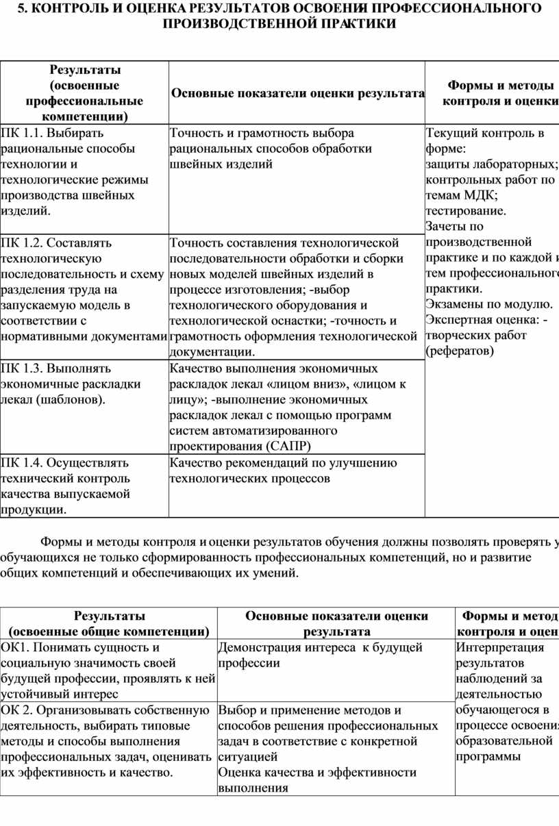 5. Контроль и оценка результатов освоения профессионального ПРОИЗВОДСТВЕННОЙ ПРАКТИКИ
