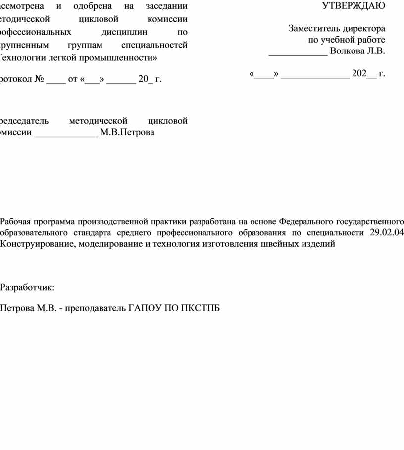 Рассмотрена и одобрена на заседании методической цикловой комиссии профессиональных дисциплин по укрупненным группам специальностей «Технологии легкой промышленности» Протокол № ____ от «___» ______ 20_ г.