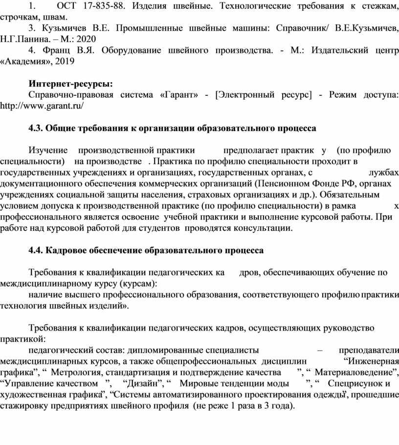 наличие высшего профессионального образования, соответствующего профилю практики «Технологии швейного производства» и специальности «Конструирование ,моделирование и технология швейных изделий».