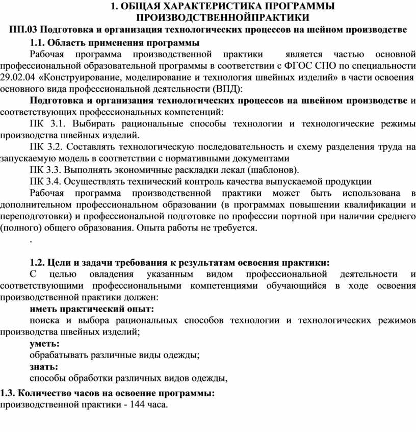 Рабочая программа производственной практики разработана на основе Федерального государственного образовательного стандарта среднего профессионального образования по специальности 29.02.04 Конструирование, моделирование и технология изготовления швейных изделий