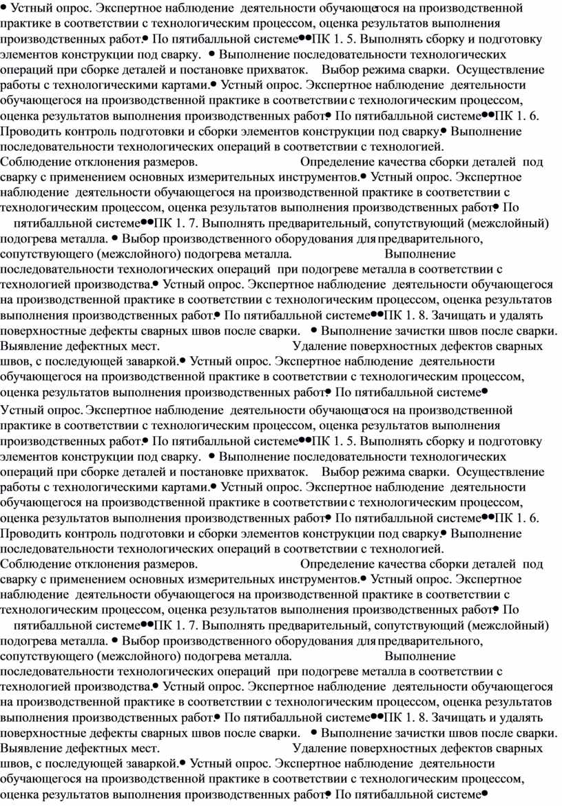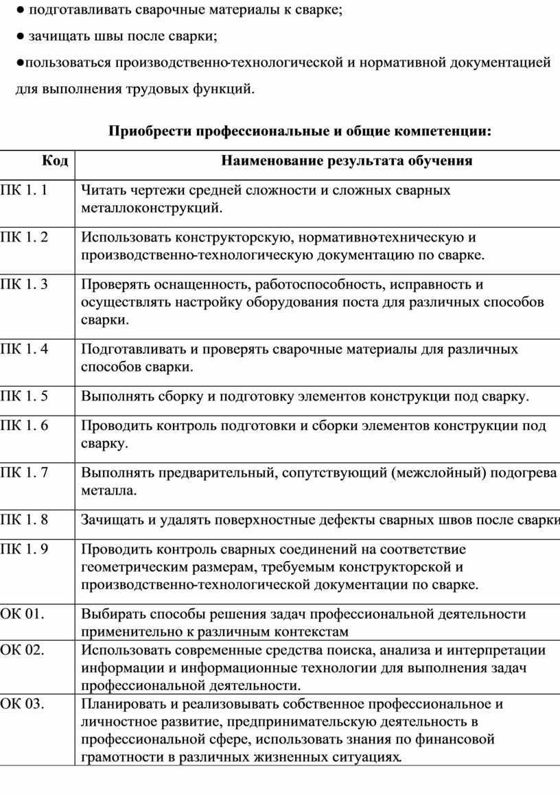 ПК 1.1. Читать чертежи средней сложности и сложных сварных металлоконструкций. ПК 1.2. Использовать конструкторскую, нормативно-техническую и производственно-технологическую документацию по сварке. ПК 1.3. Проверять оснащенность, работоспособность, исправность и осуществлять настройку оборудования поста для различных способов сварки. ПК 1.4. Подготавливать и проверять сварочные материалы для различных способов сварки. ПК 1.5. Выполнять сборку и подготовку элементов конструкции под сварку. ПК 1.6. Проводить контроль подготовки и сборки элементов конструкции под сварку. ПК 1.7. Выполнять предварительный, сопутствующий (межслойный) подогрева металла. ПК 1.8. Зачищать и удалять поверхностные дефекты сварных швов после сварки. ПК 1.9. Проводить контроль сварных соединений на соответствие геометрическим размерам, требуемым конструкторской и производственно-технологической документации по сварке.