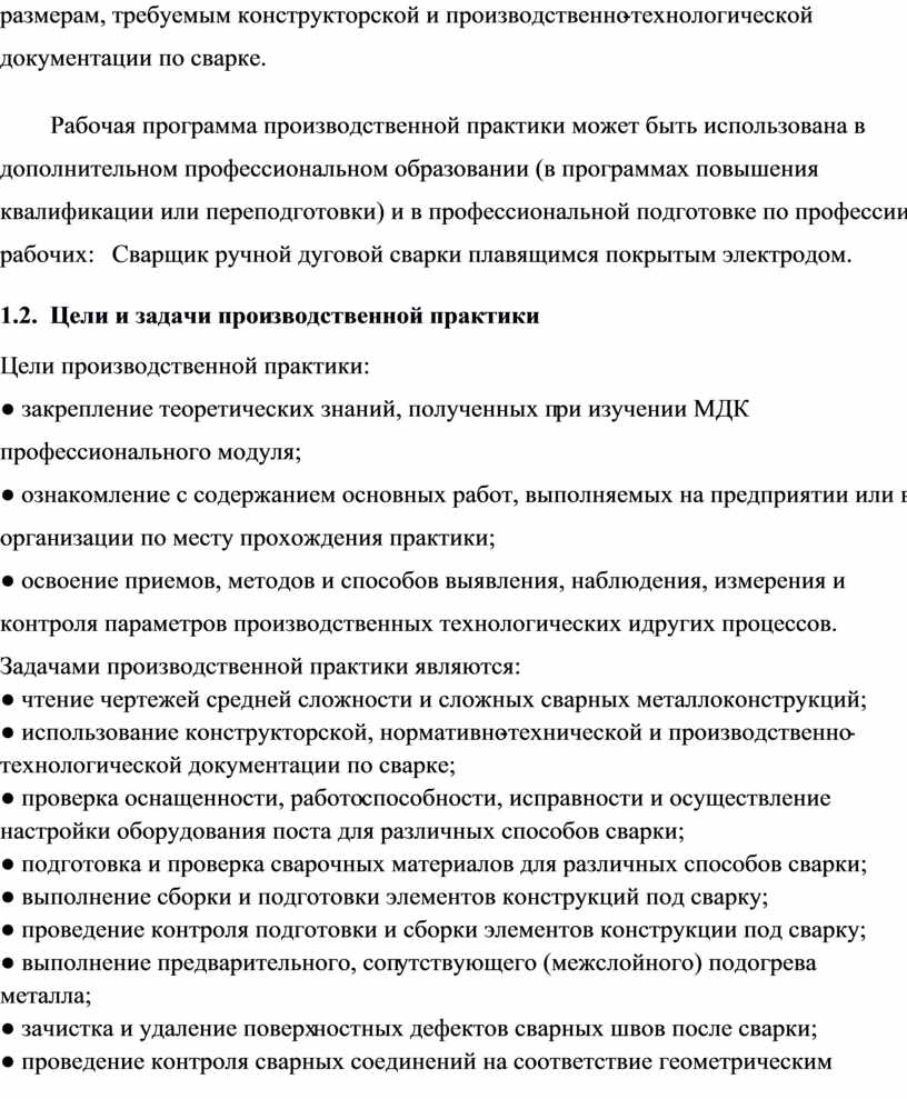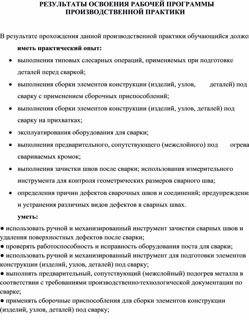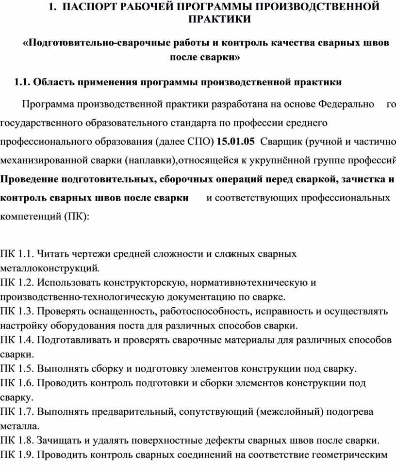 Программа производственной практики разработана на основе Федерального государственного образовательного стандарта по профессии среднего профессионального образования (далее СПО) 15.01.05 Сварщик (ручной и частично механизированной сварки (наплавки), относящейся к укрупнённой группе профессий 15.00.00 Машиностроение, в части освоения профессиональной деятельности (ПД) Проведение подготовительных, сборочных операций перед сваркой, зачистка и контроль сварных швов после сварки и соответствующих профессиональных компетенций (ПК):