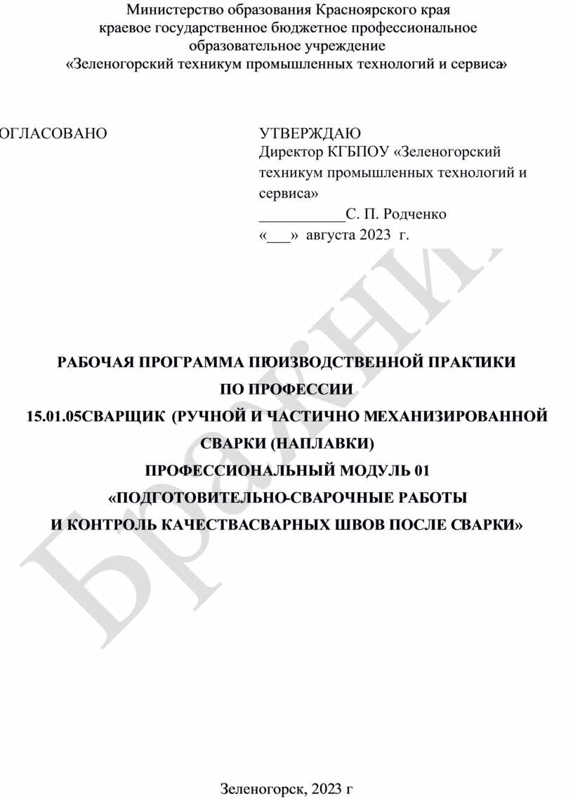 УТВЕРЖДАЮ Директор КГБПОУ «Зеленогорский техникум промышленных технологий и сервиса» ___________С. П. Родченко «___» августа 2023 г. |
