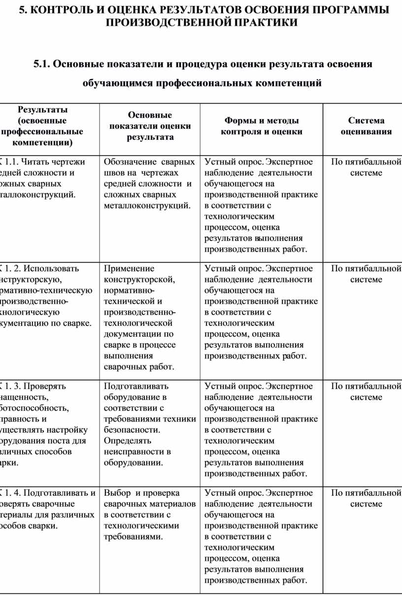 5. КОНТРОЛЬ И ОЦЕНКА РЕЗУЛЬТАТОВ ОСВОЕНИЯ ПРОГРАММЫ ПРОИЗВОДСТВЕННОЙ ПРАКТИКИ