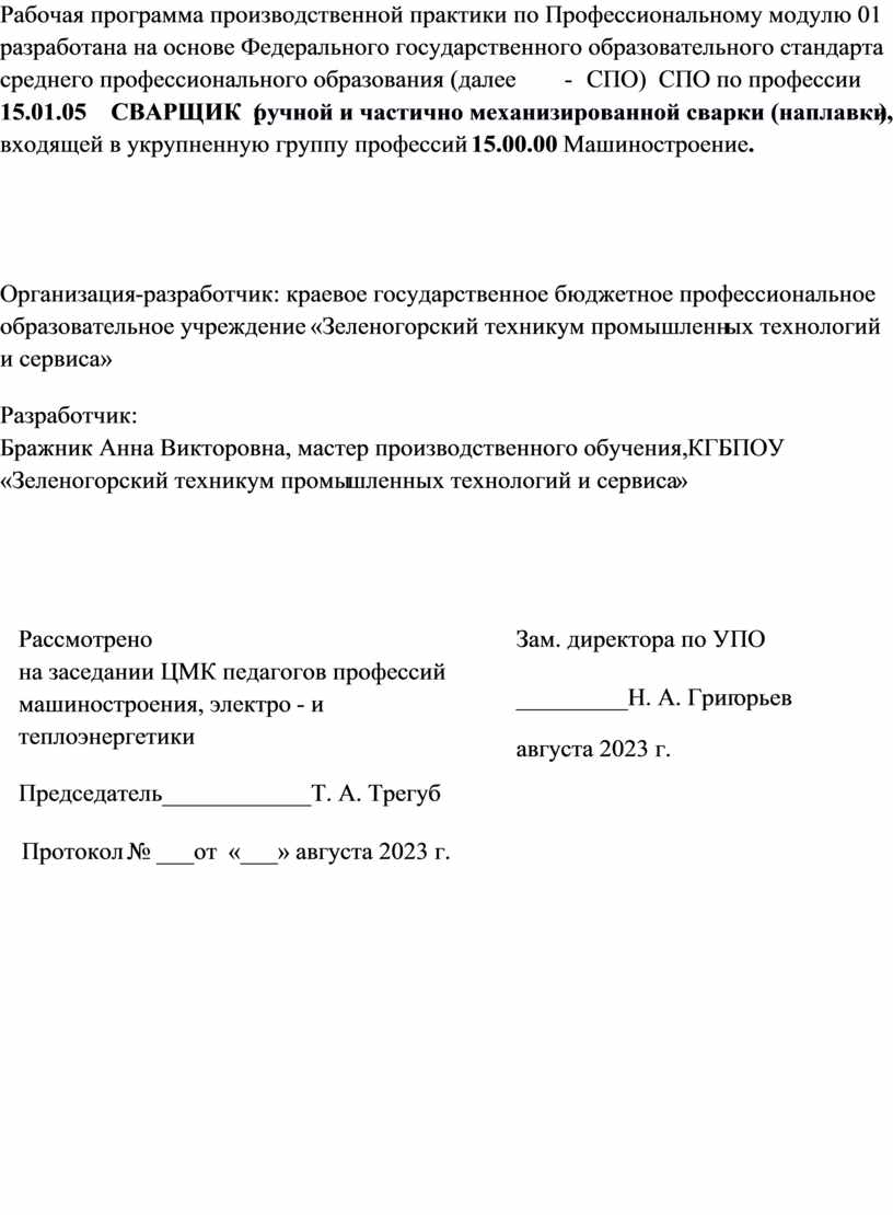 Рабочая программа производственной практики по Профессиональному модулю 01 разработана на основе Федерального государственного образовательного стандарта среднего профессионального образования (далее - СПО) СПО по профессии 15.01.05 СВАРЩИК (ручной и частично механизированной сварки (наплавки), входящей в укрупненную группу профессий 15.00.00 Машиностроение.
