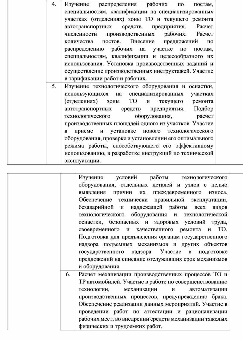 Изучение условий работы подвижного состава, отдельных деталей и узлов автомобилей с целью выявления причин их преждевременного износа, анализ причин и продолжительности простоев, связанных с техническим состоянием подвижного состава, разработка мероприятий по увеличению сроков его службы, сокращению простоев из-за технических неисправностей. Участие в рассмотрении рационализаторских предложений по вопросам поддержания подвижного состава в технически исправном состоянии, обеспечение внедрения принятых предложений. Изучение и анализ имеющихся на предприятии различных технологических карт. |