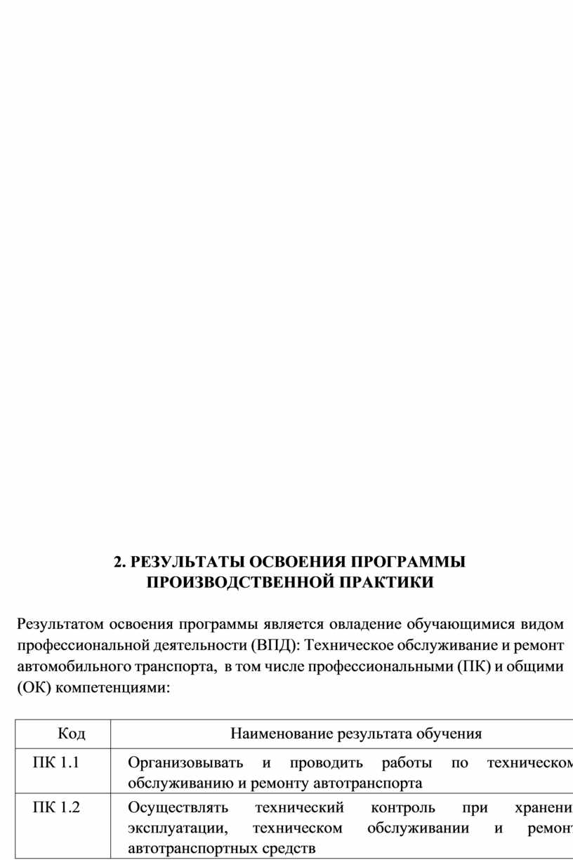 Рабочая программа производственной практики (далее рабочая программа) – является частью программы подготовки специалистов среднего звена в соответствии с ФГОС по специальности 23.02.03 Техническое обслуживание и ремонт автомобильного транспорта (базовой подготовки) в части освоения основного вида профессиональной деятельности (ВПД): Организация и проведение работ по техническому обслуживанию и ремонту автомобильного транспорта, организация деятельности первичных трудовых коллективов и соответствующих профессиональных компетенций (ПК):