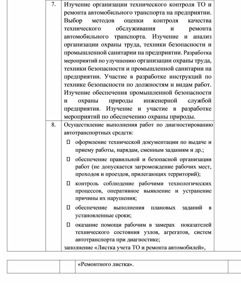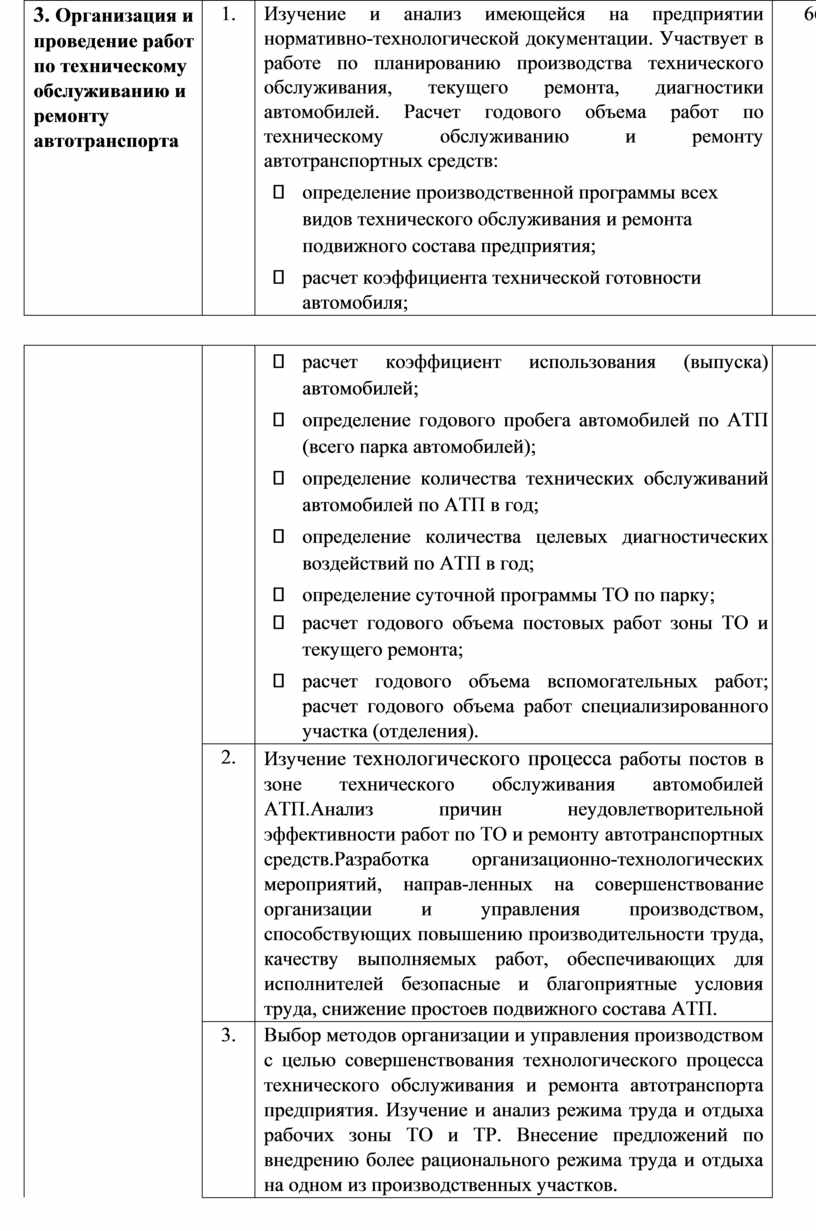 Изучение организации технического контроля ТО и ремонта автомобильного транспорта на предприятии. Выбор методов оценки контроля качества технического обслуживания и ремонта автомобильного транспорта. Изучение и анализ организации охраны труда, техники безопасности и промышленной санитарии на предприятии. Разработка мероприятий по улучшению организации охраны труда, техники безопасности и промышленной санитарии на предприятии. Участие в разработке инструкций по технике безопасности по должностям и видам работ. Изучение обеспечения промышленной безопасности и охраны природы инженерной службой предприятия. Изучение и участие в разработке мероприятий по обеспечению охраны природы. |